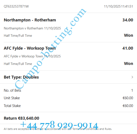 | 11.10.2025 | AFC Fylde vs Worksop | 1/2 | 41.00 | 1:0 / 2:3 |