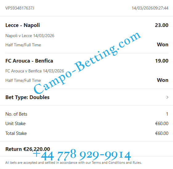 | 14.03.2026 | Napoli vs Lecce | 2/1 | 23.00 | 0:1 / 2:1 |