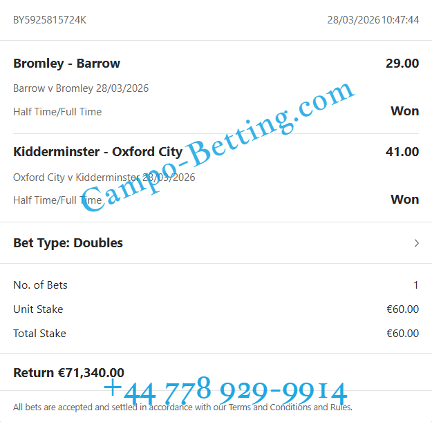 | 28.03.2026 | Barrow vs Bromley | 2/1 | 29.00 | 0:1 / 2:1 |